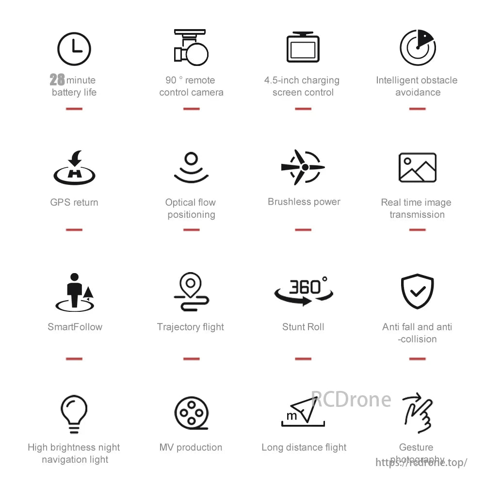 28-minute battery, 90° remote control camera, 4.5-inch screen, intelligent obstacle avoidance, GPS return, optical flow positioning, brushless power, real-time image transmission, smart follow, trajectory flight, stunt roll, anti-fall/collision, high brightness night light, MV production, long-distance flight, gesture photography.