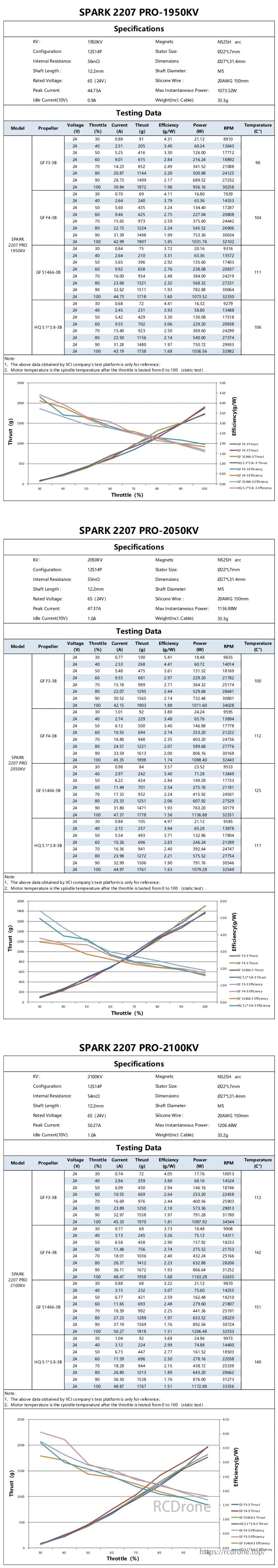 SPARK 2207 Pro motor specs: 1950KV, 2050KV, 2100KV. Configurations include 12S14P. Rated voltage 6S (24V). Peak currents vary from 44.73A to 50.27A. Max power up to 1136.8W. Idle current 0.9A-1.0A. Weight 33.2g-33.6g.