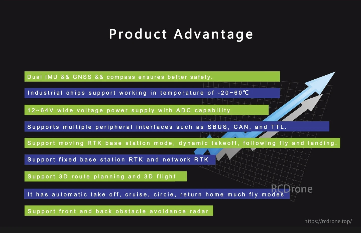 With support for both fixed and moving RTK base stations, the system ensures accurate dynamic positioning. It offers rich interface compatibility (SBUS, CAN, TTL) and runs on a wide 12V~64V voltage input. The Ground Control Software (GCS) supports both Windows and Android, available in Chinese and English.