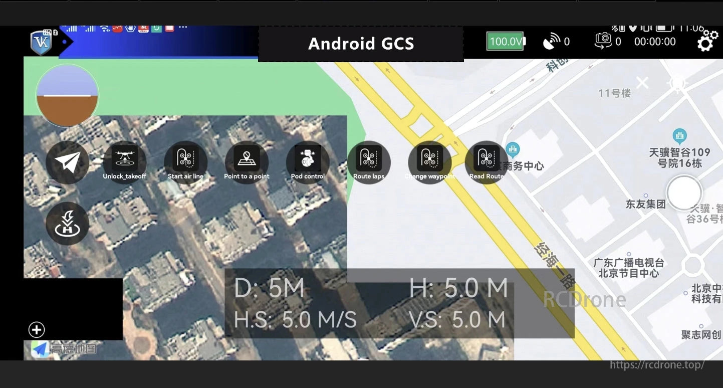 Flight control options include unlock takeoff, start air line, point-to-point, pod control, route laps, change waypoint, and read route. Metrics: D: 5M, H: 5.0M, H.S: 5.0 M/S, V.S: 5.0M.