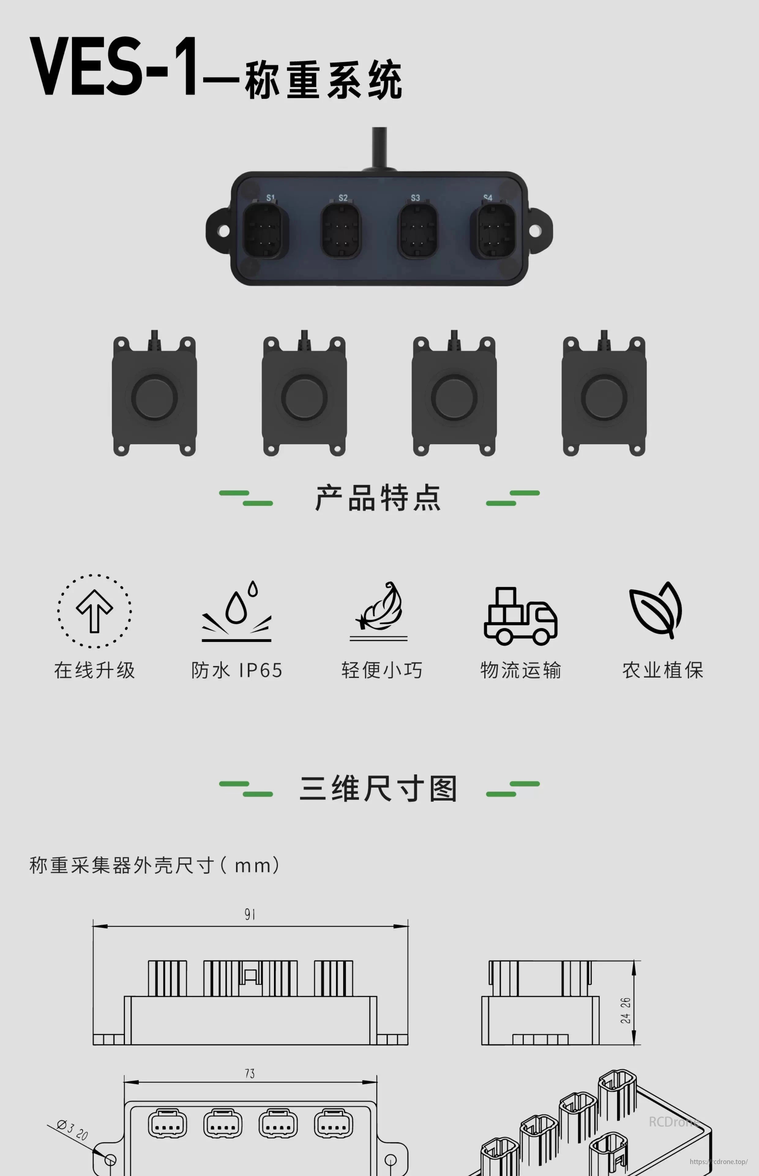 VES-1 UAV Scale offers online upgrades, IP65 waterproofing, compact design for logistics and agriculture. Size: 91x73x24.2mm.