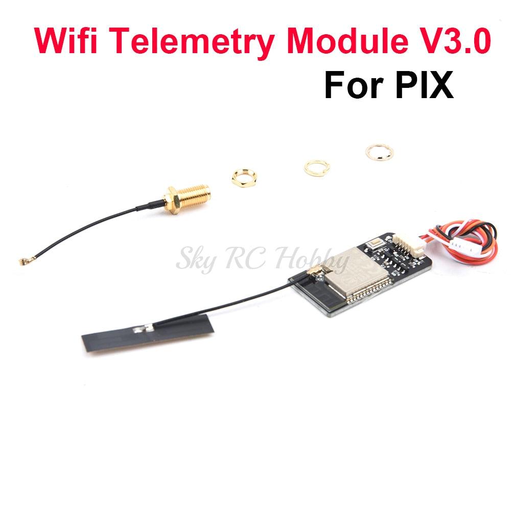 This wireless WiFi radio telemetry module features an antenna for use with the New MavLink2 for Pixhawk APM flight controller, providing FPV drone and smartphone/tablet compatibility. The module includes a range of components, including: * DSM receiver with on-screen display * LJD SPI (serial peripheral interface) bus * Serial GPS module * CAN (controller area network) bus * P/C splitter or compass module * Analog-to-digital converter (6V and 3V) * LED indicator for power status and other functions.