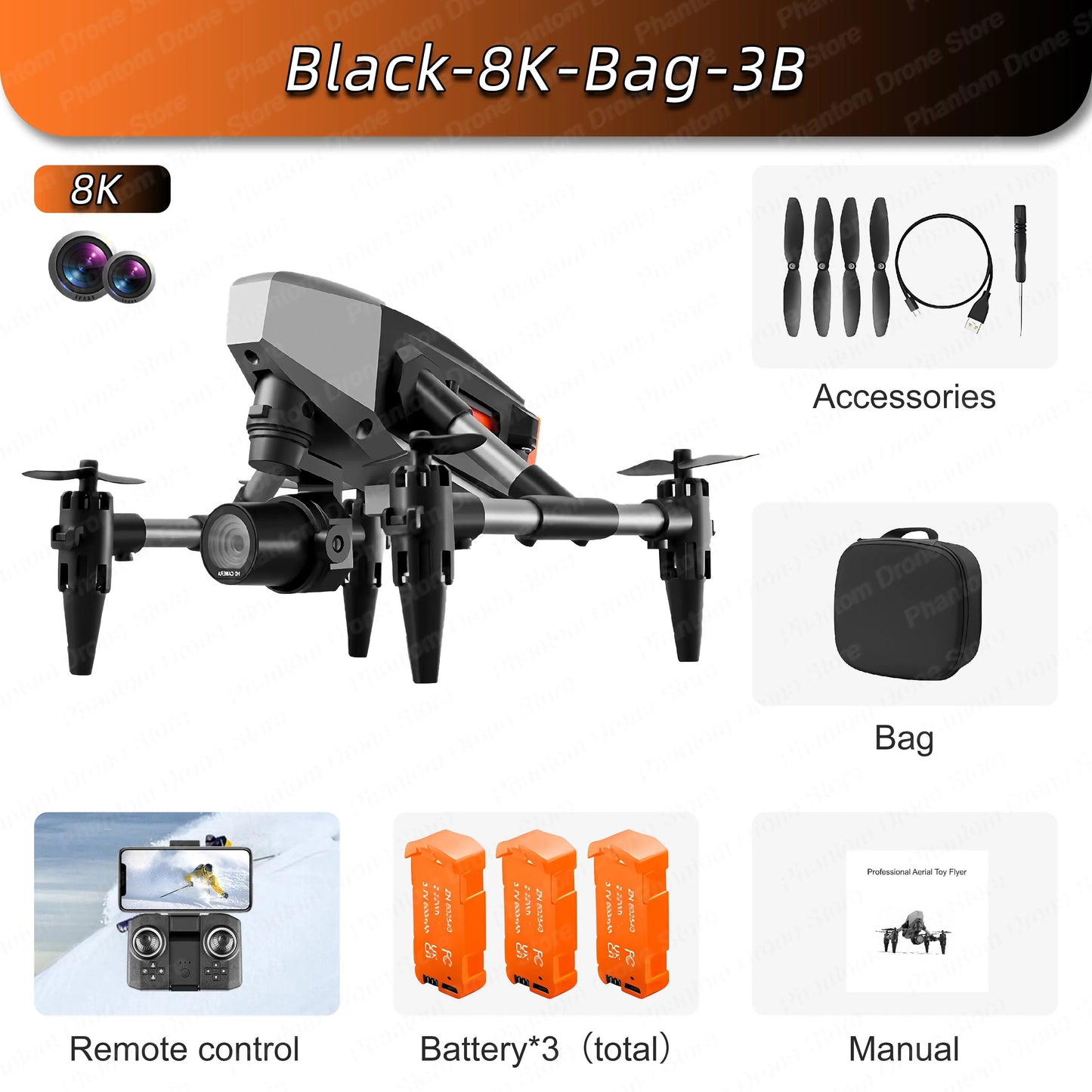 aerocraft x1 Accessories: Spare propeller, USB smart charging cable, screwdriver, storage bag, spare propeller . x2 Operation manual, x3 Maintenance manual and x4 Operation guide .