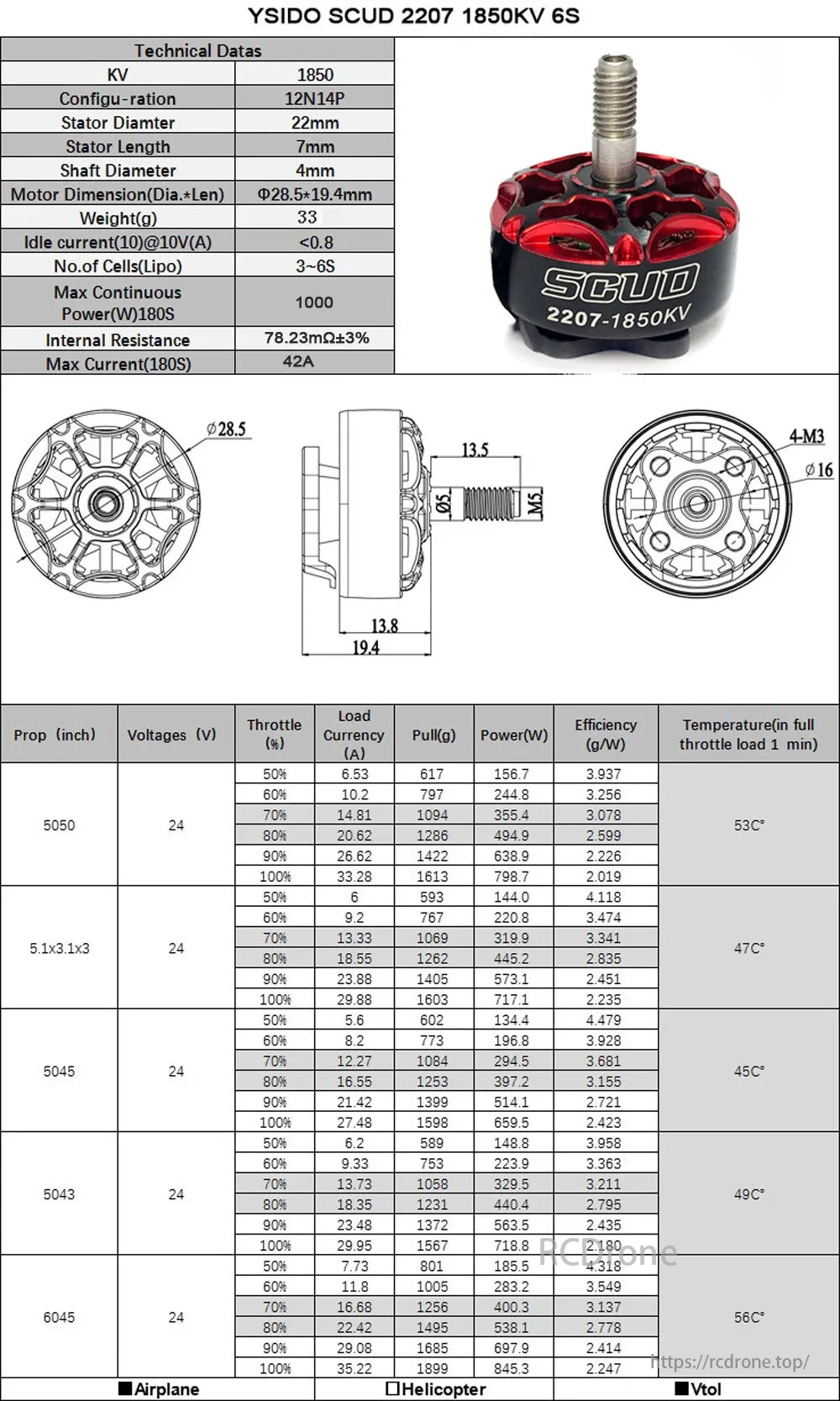 YSIDO SCUD 2207 1850KV 6S motor specs: KV 1850, 12N14P, 22mm stator, 33g. Max power 1000W, 42A. Tested with props at 24V for load, pull, efficiency, and temp data.