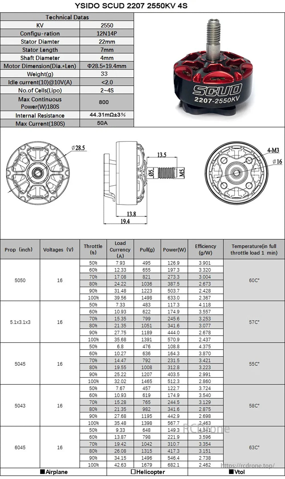 YSIDO SCUD 2207 motor specs: KV 2550, 12N14P, 22mm diameter, 7mm length, 33g weight. Max 800W power, 50A current. Tested with props at 16V for performance metrics like pull and efficiency.