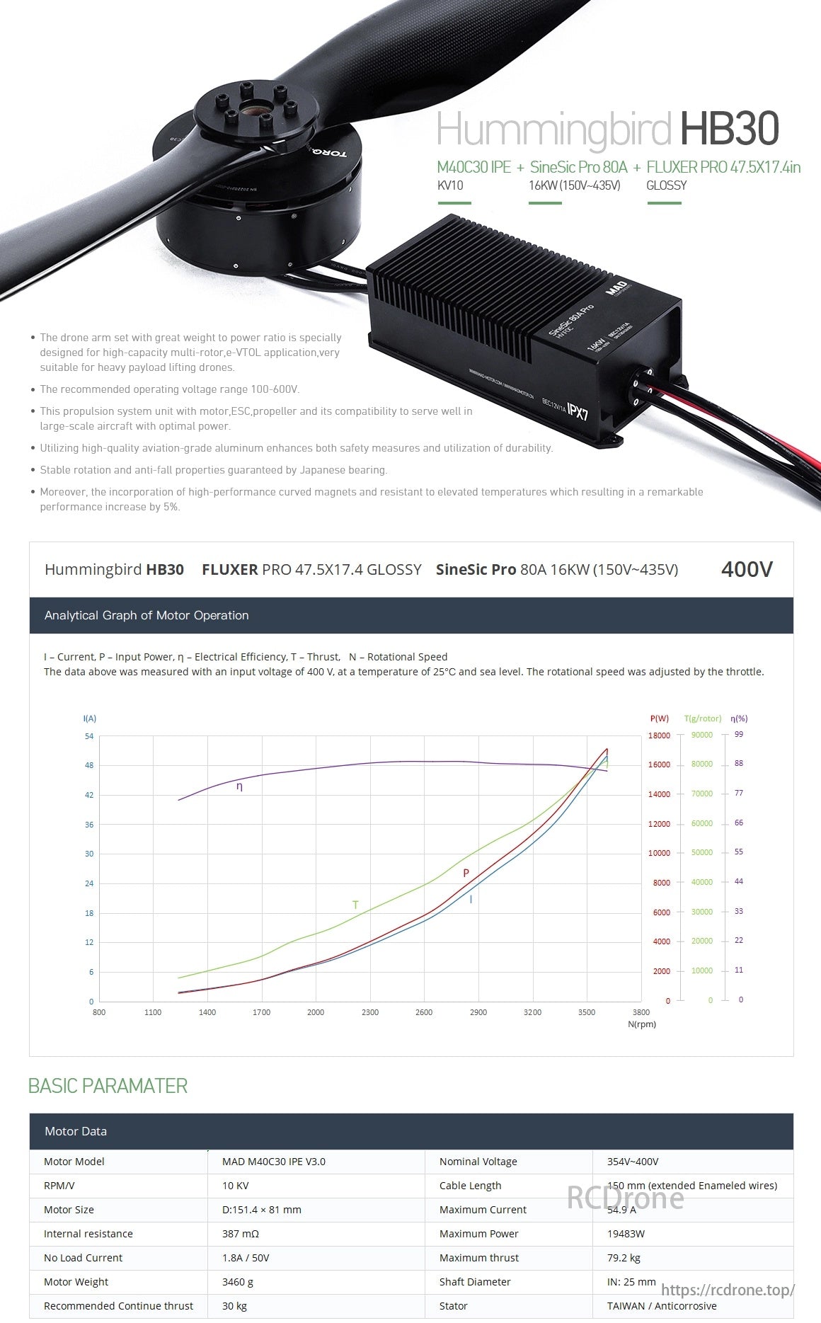 Hummingbird HB30 framdrivningssystem inkluderar M40C30 IPE-motor, SineSic Pro 80A ESC och FLUXER PRO-propeller. Designad för att lyfta drönare med tung nyttolast, den arbetar på 100-600V med hög effektivitet och hållbarhet. Grafer visar prestandamått som ström, effekt, dragkraft och rotationshastighet. Grundparametrarna inkluderar motorstorlek, vikt och maximal dragkraft.