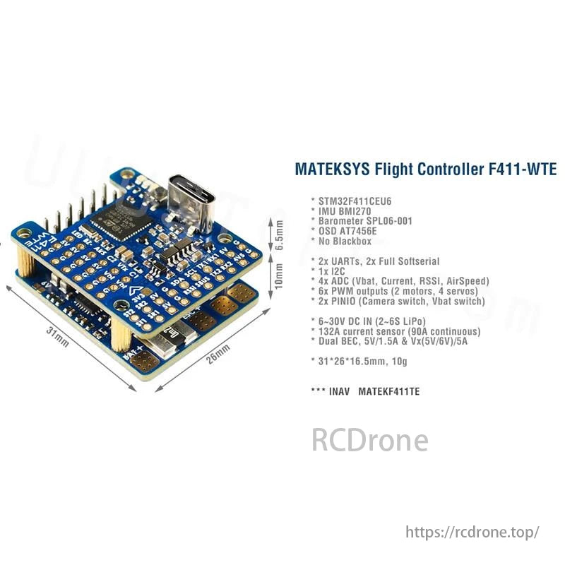 MATEKSYS Flight Controller F411-WTE STM3ZFAIICEU6 IMU BMI27O Barometer SPLO6-001 OSD AT7456E 1 No Blackbox 2x UARTs, Zx Full Softserial Ix 12C 1 Ax ADC (Vbat; 2 Current, PINS-switch) (Vbat; AirSpIORSSI) 132A strömsensor (90A kontinuerlig)