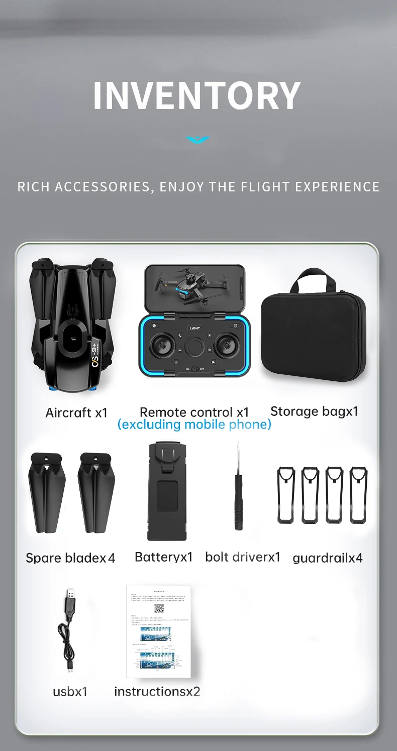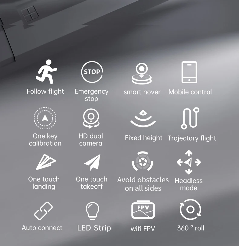 Kazi: juu / chini / mbele / nyuma / kushoto / kulia, ndege ya kando, mwanga wa LED, hali isiyo na kichwa, ufunguo mmoja wa kurudi kiotomatiki, hali ya kushikilia mwinuko, WiFi FPV (lenzi mbili zenye kipengele cha kubadili lenzi mbili)