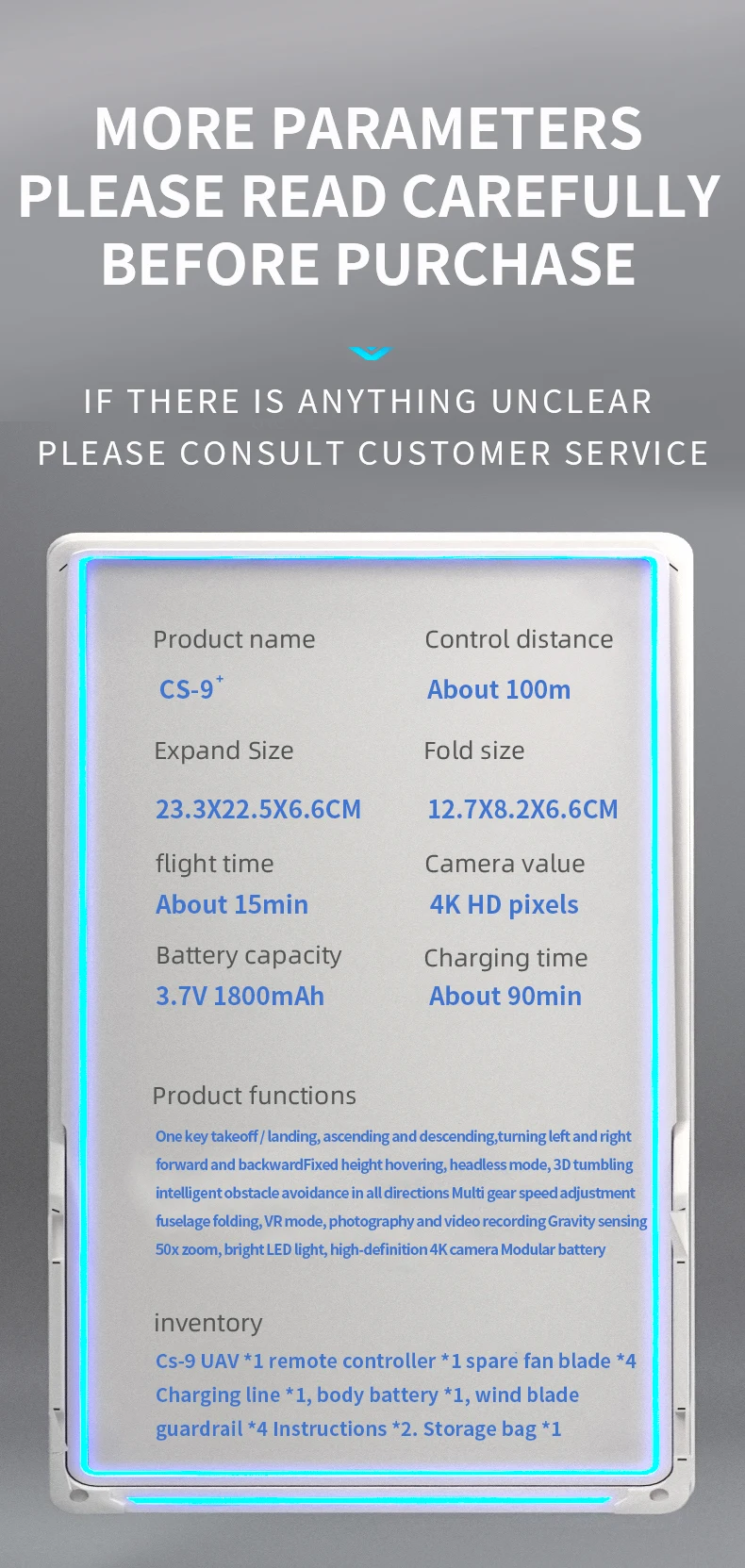 2: UAV ina kazi ya kudumisha hali ya mwinuko mara kwa mara, kuepusha vizuizi vya infrared vya pande nne, kuweka lenzi mbili za mtiririko wa macho, na kuruka kwa utulivu. t286> 3: Katika hali isiyo na kichwa, hakuna haja ya kutofautisha mwelekeo wa fuselage.