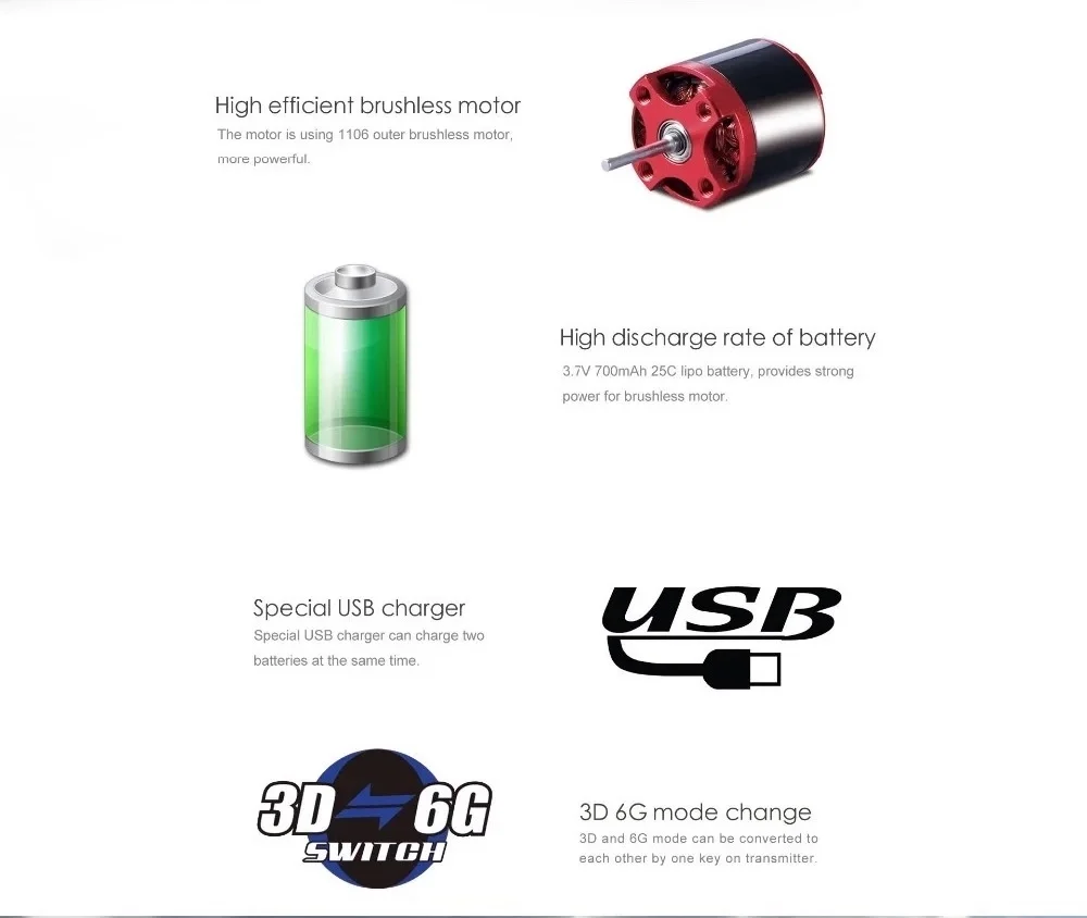 ● Matumizi ya 1106 ya mzunguko wa nje ya motor isiyo na brashi ni yenye nguvu zaidi, 3. Betri ya 7v 450mah 25c ya kiwango kikubwa.