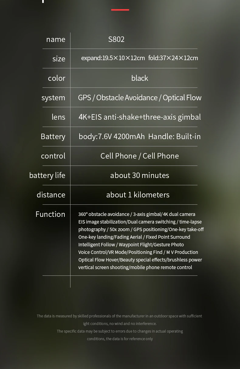 Uzak Mesafe: 1000M Uzaktan Kumanda: Evet Önerilen Yaş: 12+y Önerilen Yaş: 14+y Güç Kaynağı: Elektrik Fişler Tip: USB Paket İçeriği: USB Kablosu Paket İçeriği: Kamera Paket İçeriği: Uzaktan Kumanda Paket İçeriği: Kullanım Talimatları Paket İçeriği: Piller Paket İçeriği: Orijinal Kutu Menşei: Çin Anakarası Operatör Beceri Düzeyi: Uzman Operatör Beceri Düzeyi: Orta Operatör Beceri Düzeyi: Başlangıç Motor: Fırçalar s Motor Model Numarası: S802 Pro Malzeme: Plastik Malzeme: Metal İç/Dış Mekan Kullanımı: İç-Dış Mekan Uçuş Süresi: Yaklaşık 30 dakika Özellikler: Beni Takip Et Özellikler: GPS Özellikler: Otomatik Dönüş Özellikler: Engellerden Kaçınma Özellikler: Wi-Fi Özellikler: FPV Özelliği Özellikler: Entegre Kamera Boyutlar: 19,5*10*12cm(Genişletilmiş) Denetleyici Modu: MODE1 Denetleyici Modu: MODE2 Denetleyici Pili: AAA*3 Kontrol Kanalları: 4 Kanal Şarj Voltajı: 7.4V4200MAH Şarj Süresi : 180 dakika Sertifika: CE Kamera Montaj Tipi: 3 eksenli Gimbal Marka Adı: Orstarry Barkod: Hayır Havadan Fotoğrafçılık: Evet