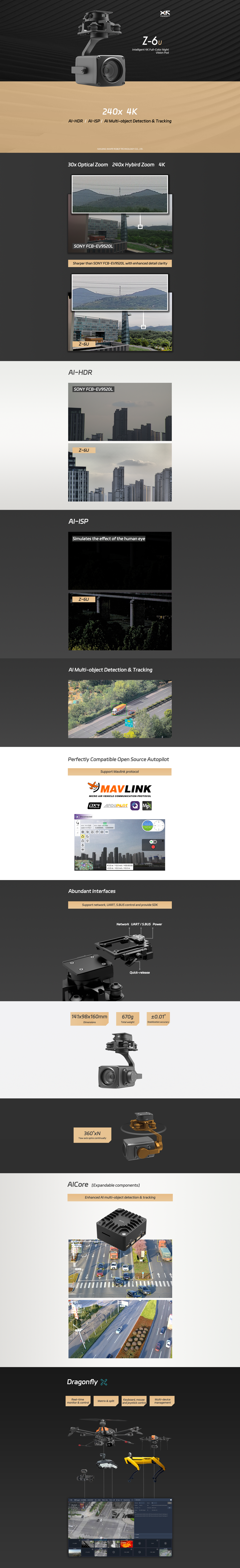 Z-6U, stabilize edilmiş, yüksek çözünürlüklü gündüz/gece görüntüleme ve yerleşik AI tespiti gerektiren birden fazla taşıyıcıda entegrasyon için tasarlanmıştır.Tipik kullanımlar arasında hava denetimi ve izleme, altyapı ve çevre gözlemi, trafik ve sahne kaydı ile uzun menzil algılama ve tam renkli düşük ışık performansının gerektiği diğer endüstriyel veya sivil uygulamalar bulunmaktadır. Cihaz, canlı görüntüleme, kontrol ve veri indirme için Dragonfly ve XF-QGC gibi yer kontrol üniteleri ve yazılımlarla bağlantıyı desteklemektedir.
