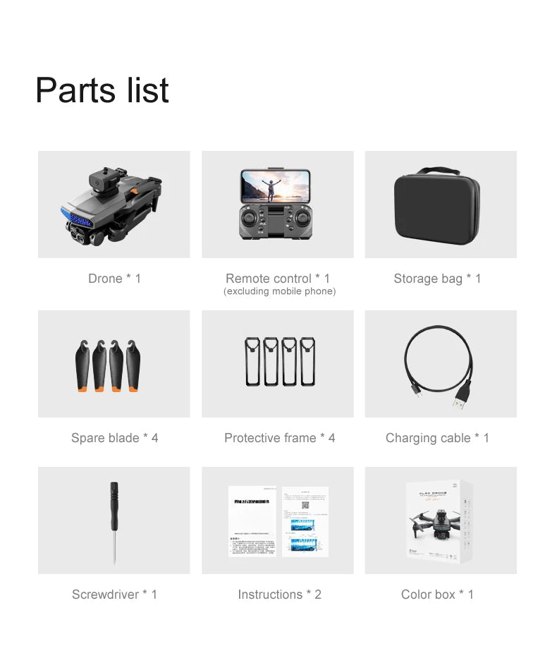 配件清單無人機遙控收納(不含手機)備用刀片保護架充電線螺絲起子說明書彩盒