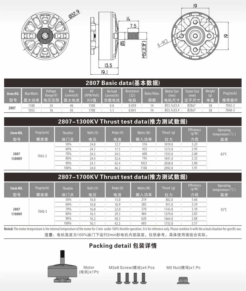 1300KV:最大 1400 W(6S),高推力、高效率(60 mΩ)