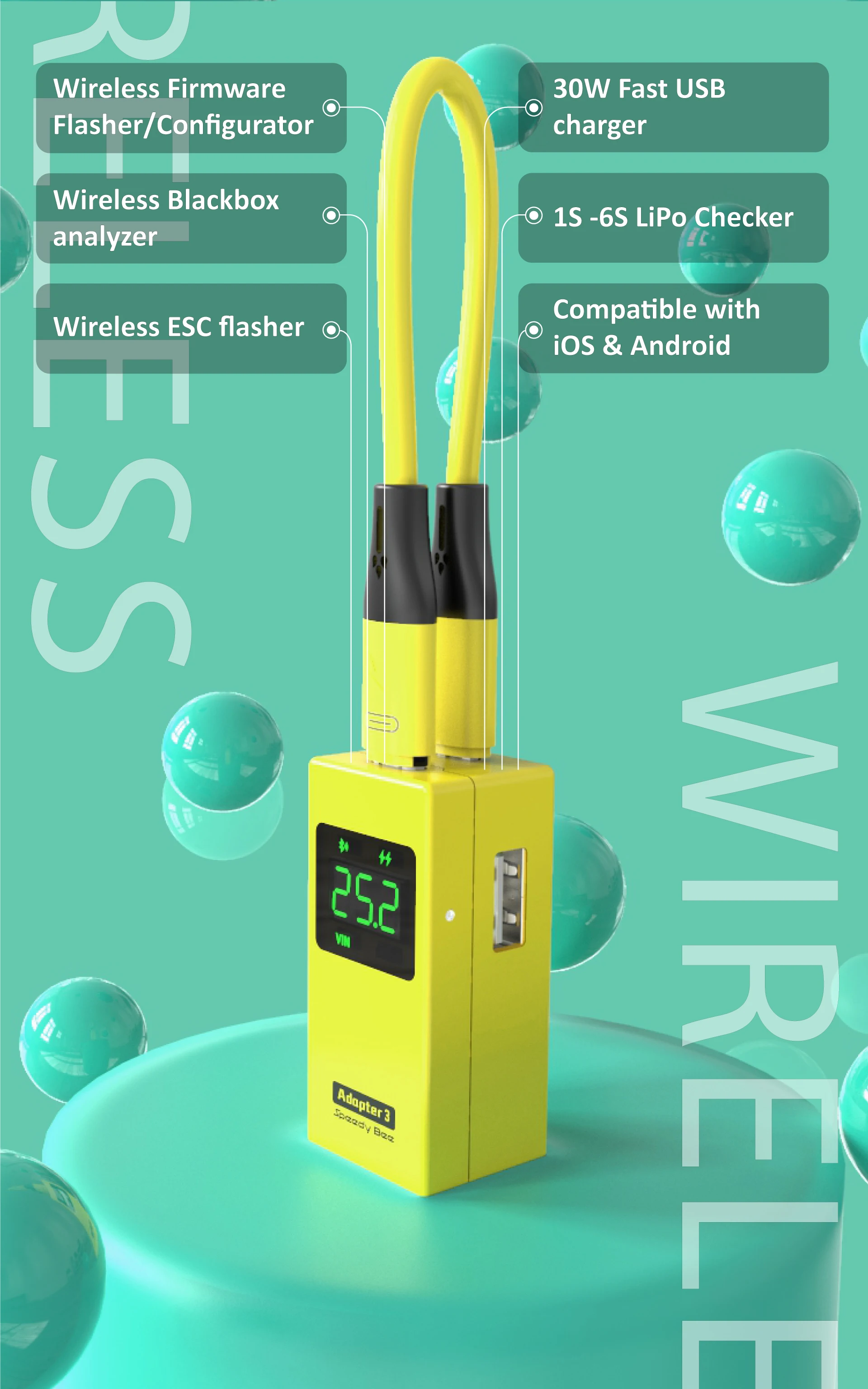 型號:適配器3 兼容運動相機品牌:Speedybee 品牌名稱:Runcam 關於關稅:我們可以申報的價格為$20幫助您避免任何關稅。 (如果您是歐盟買家,速賣通在您付款時會收取關稅和增值稅。 因此您的包裹到達時無需再次繳納關稅。 ) 關於“免費退貨”政策:如果您對產品不滿意,您可以以任何理由將產品退回您當地的倉庫,然後獲得退款。 Speedybee 適配器 3 即將推出!!! 六大賣點: 1。 無線黑盒分析儀(如果您有帶黑盒功能的FC,可以通過Adapter3下載飛控的黑盒數據到Speedybee APP進行分析) 2。 無線固件刷新器/配置器 3。 無線電調閃光器 4。 30W 快速 USB 充電器 5。 1S-6S 脂質檢查器 6。 兼容IOS & Android 正在分析 Blackbox 數據 為什麼停在飛控處?更改您的 BLHeli_S ESC 隨時隨地更新固件。 使用最新的 SpeedyBee 應用程序無線 還有你所需要的一切 “使用 你。 支持所有帶 PH2 的 1S - 6S LiPo 那個 電壓 3。 8V),連接到 注意:使用 BT2 時。 0 電池通過 PH2 為 Adapter3 供電。 0端口,請確保極性正確(左為-,右為+) SpeedyBee 適配器 3 VS SpeedyBee 適配器 2 參數 產品名稱 SpeedyBee 適配器 3 電源輸入電壓範圍 1-6S(3. 8V+ 持續 1S) 電源輸入連接器 XT60-男,PH2。 0 男 所需的移動設備系統版本 Android 7。 0+ | iOS 12。 0+ 支持的 SpeedyBee 應用程序版本 V1。 6 1+ 適用於 iOS | V1。 5 6+ 適用於 Android 飛控最大輸出電流 700mA @5V 快充輸出接口 USB A 端口 充電輸出的最小輸入電壓 7。 4V(2S 鋰電池) 支持的快速充電協議 • QC3。 0/QC2。 0 最大快速充電電流 3。 5A 最大快速充電功率 30W 外殼材質 ABS + PC 液體矽膠電纜長度 12。 4cm 尺寸(主體) 24。 8*21。 8*53。 6mm 淨重 35g