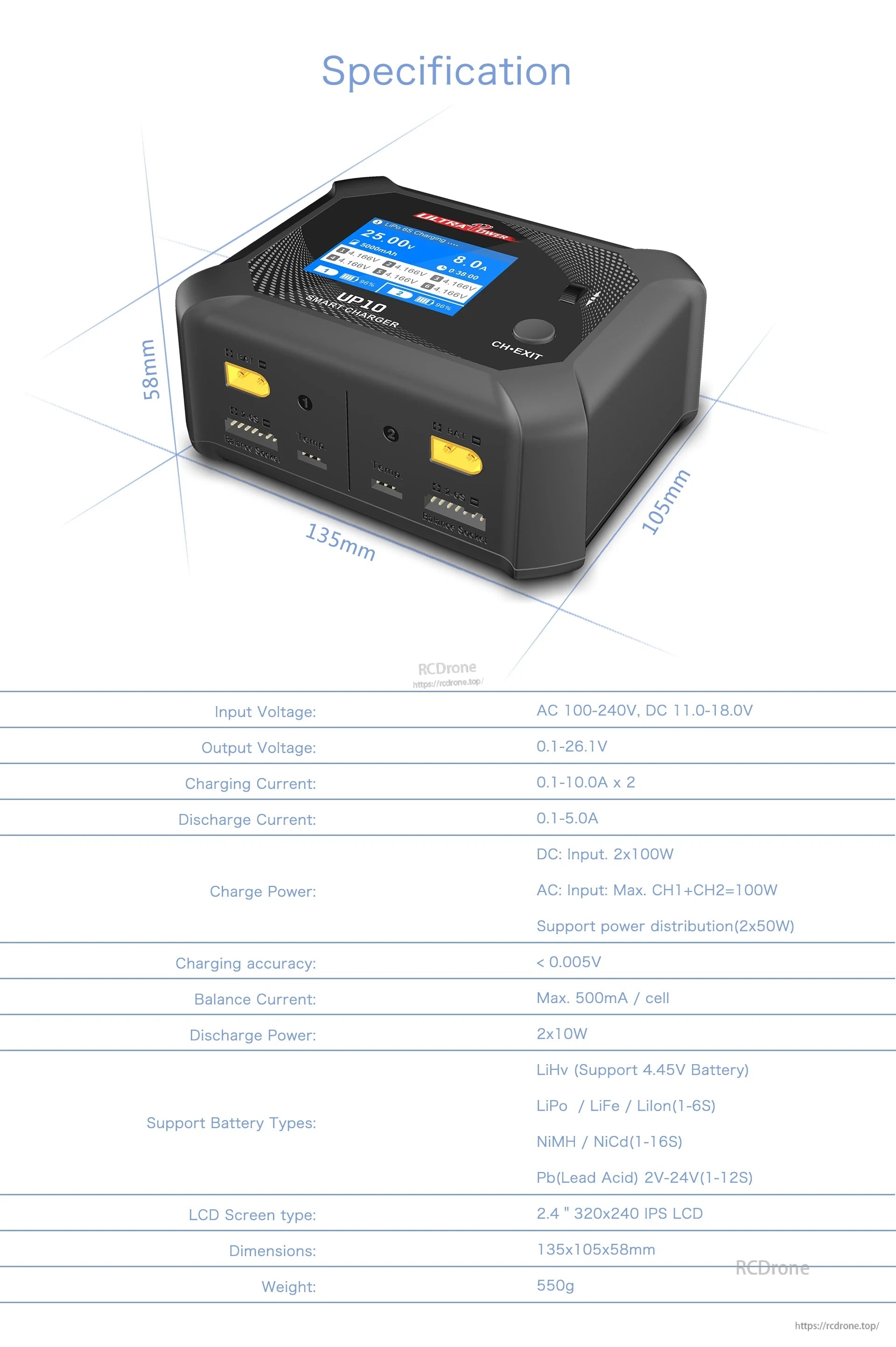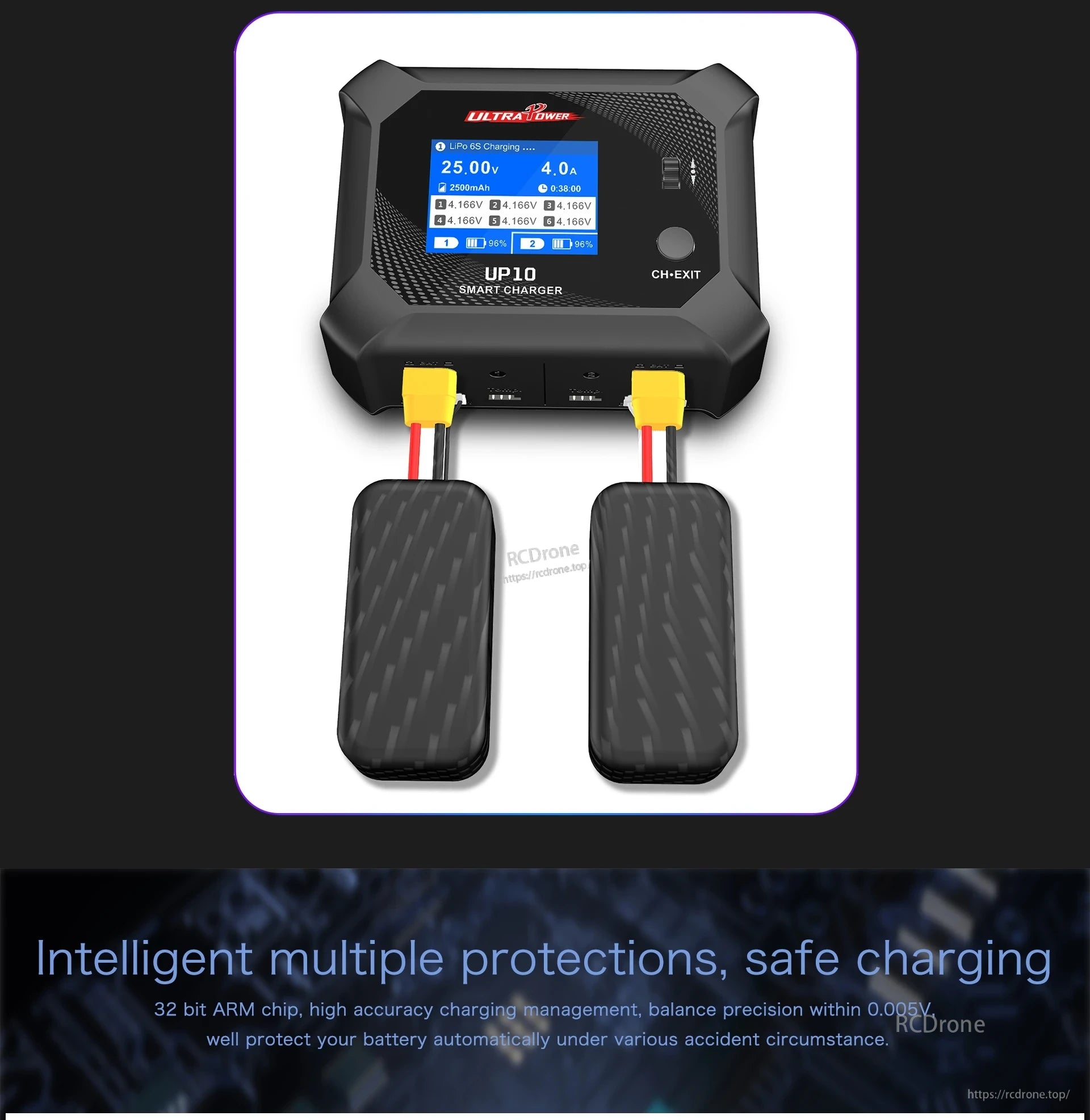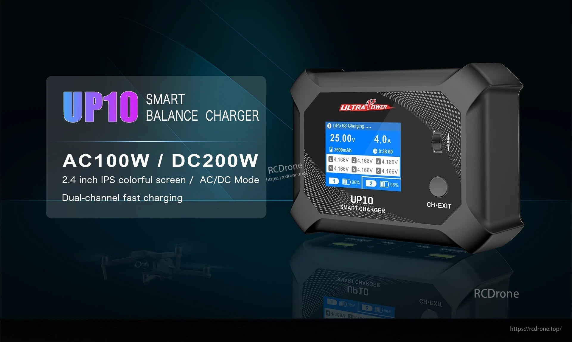 超強UP10 AC100W / DC200W智能平衡充電器是一款雙通道AC/DC充電器,適用於LiHv、LiPo、LiFe、LiIon(1-6S)、NiMH/NiCd(1-16S)和Pb(鉛酸)2V-24V(1-12S)。它集成了一個2.4英寸320x240 IPS彩色顯示屏,獨立通道每個可達10.0A,並具有充電精度< 0.005V的精確平衡。界面顯示實時數據,包括每個電池單元的電壓;屏幕示例顯示LiPo 6S充電時為25.00V,4.0A,2500mAh。