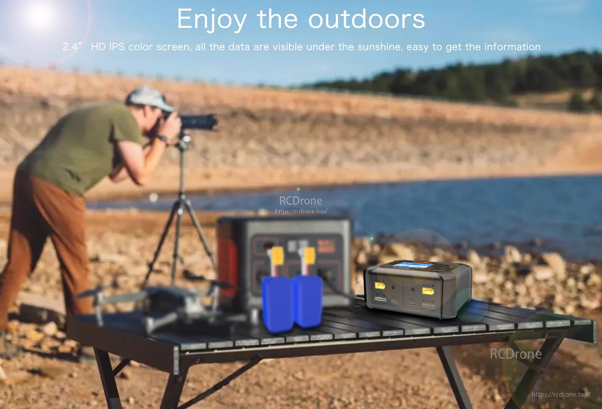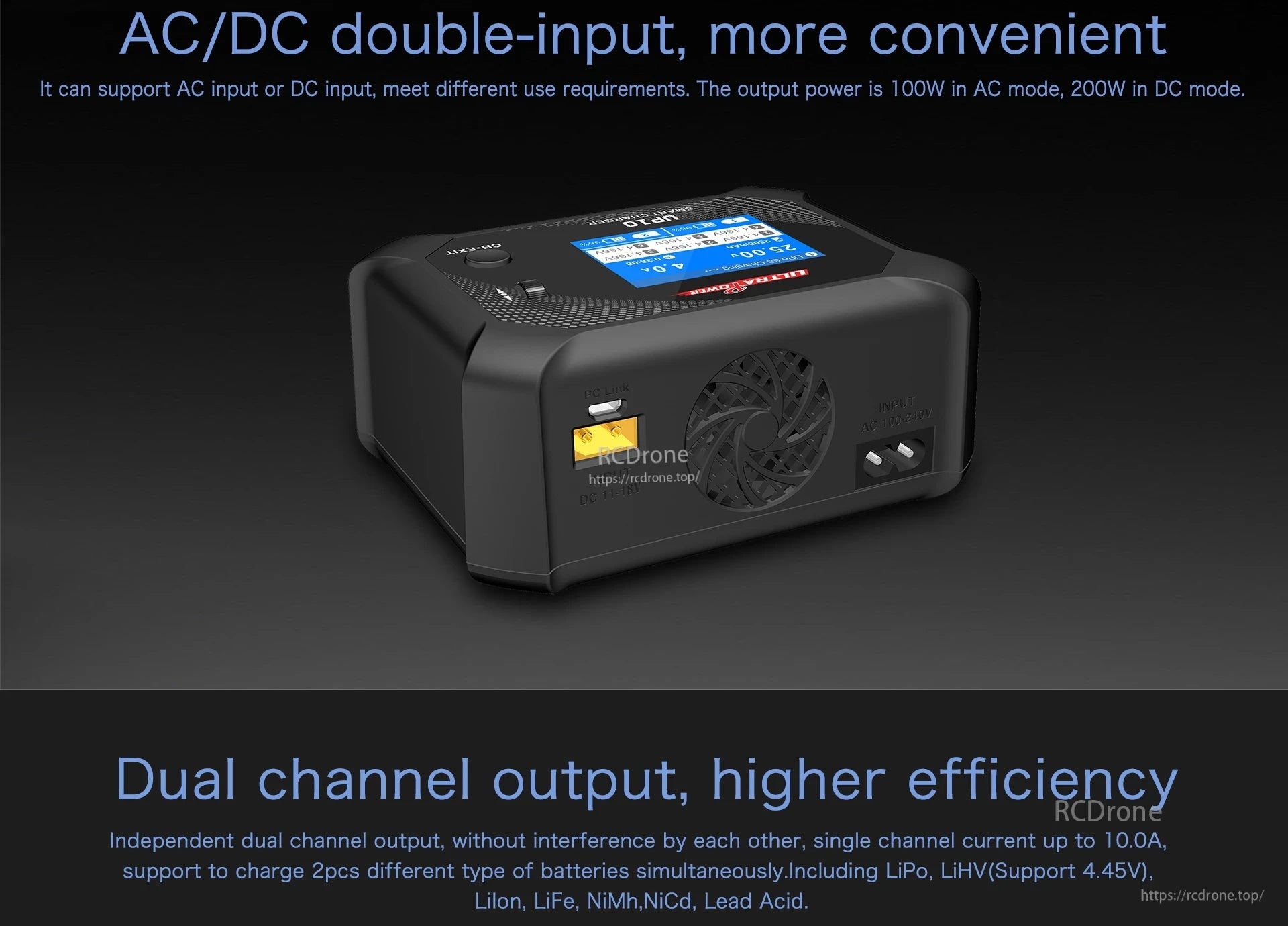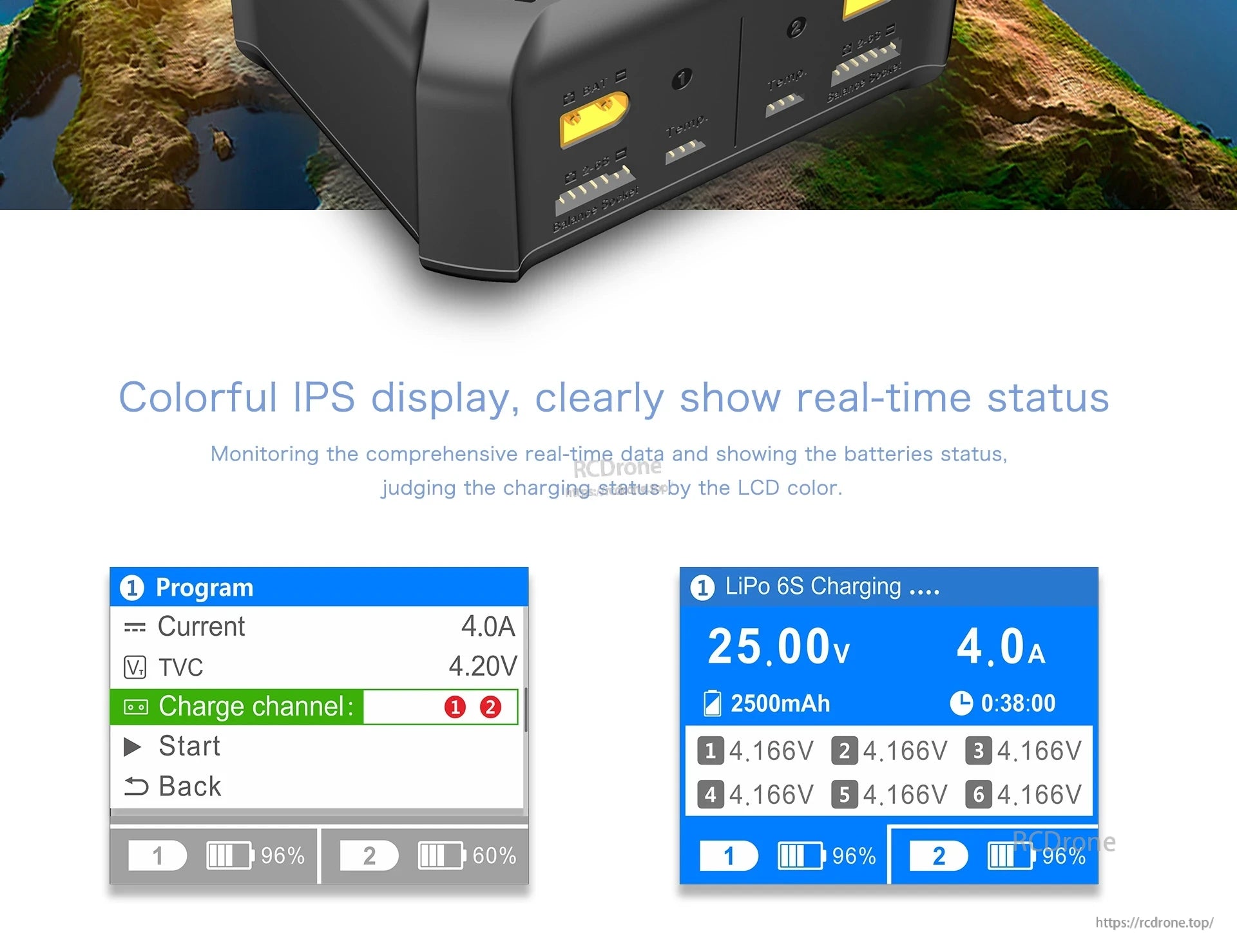適合於無人機、汽車、船隻和飛機的 RC 電池組的工作台和現場充電。雙通道和清晰的每個電池單元監控簡化了電池包的維護和充電。