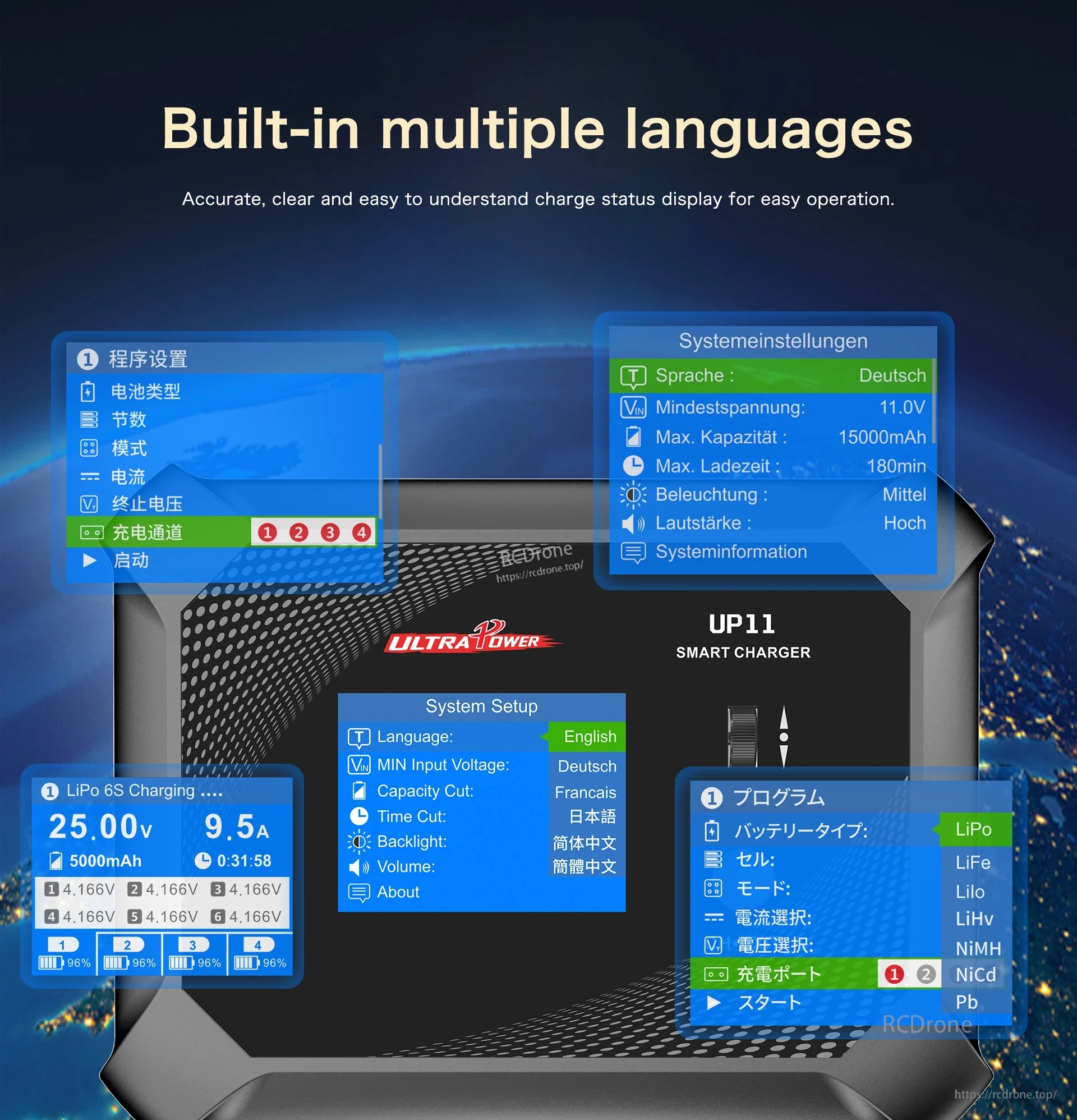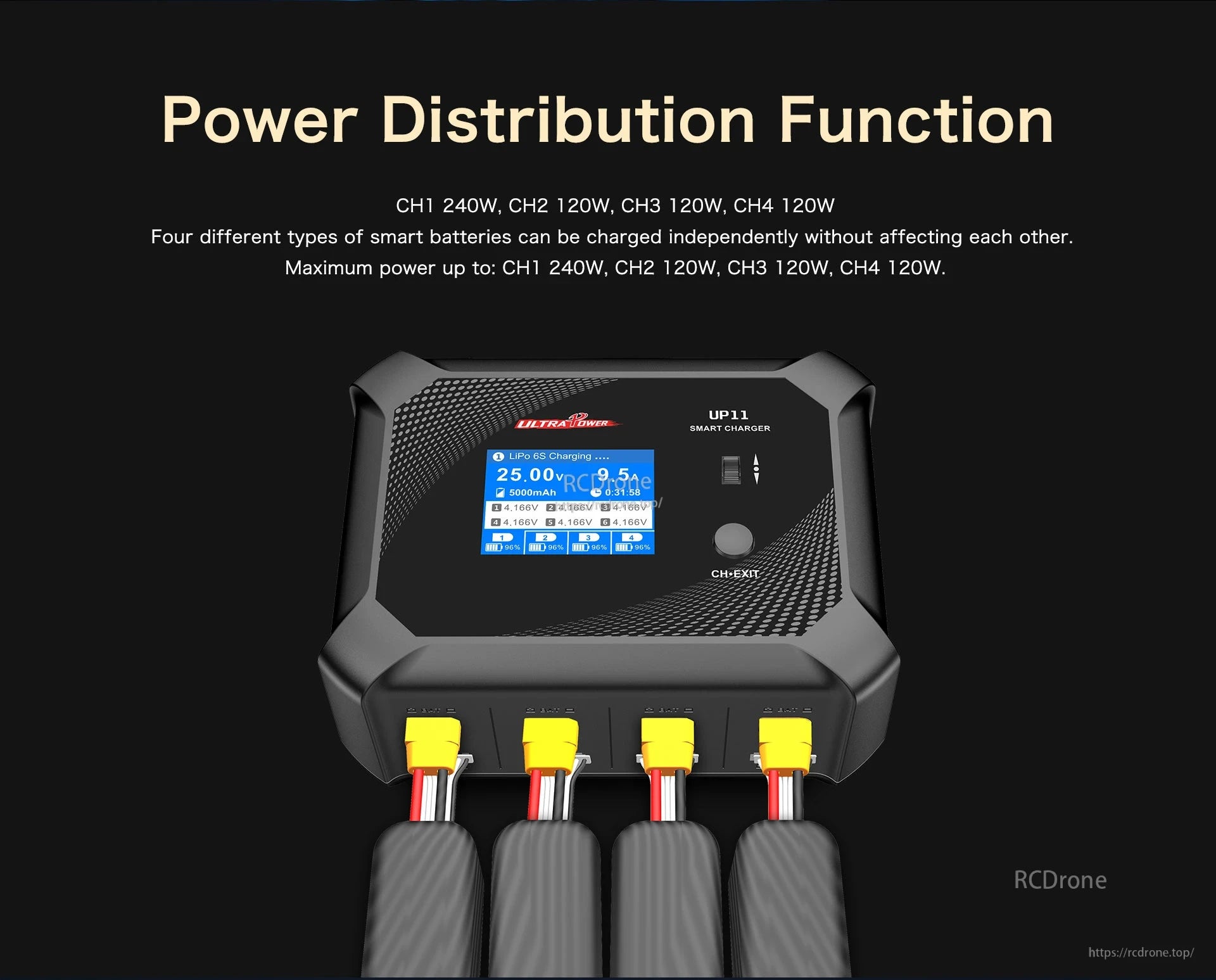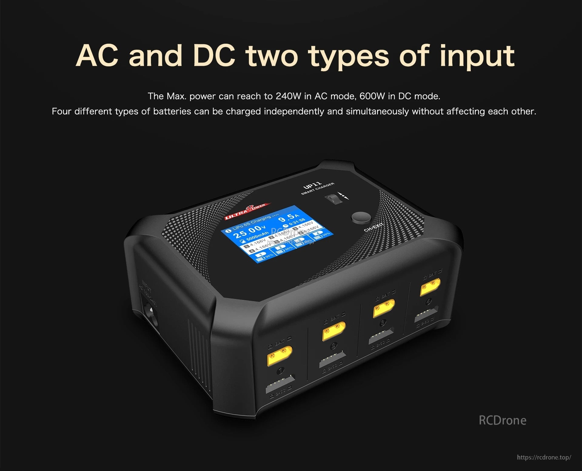 Ultra Power UP11 是一款四通道智能平衡充電器,專為 RC 嗜好電池設計。它支持 AC 和 DC 輸入,AC 輸出功率高達 240W,DC 輸出功率高達 600W。IPS HD 2.4 英寸彩色屏幕提供清晰的狀態一覽,而四個獨立通道可同時充電,互不影響。