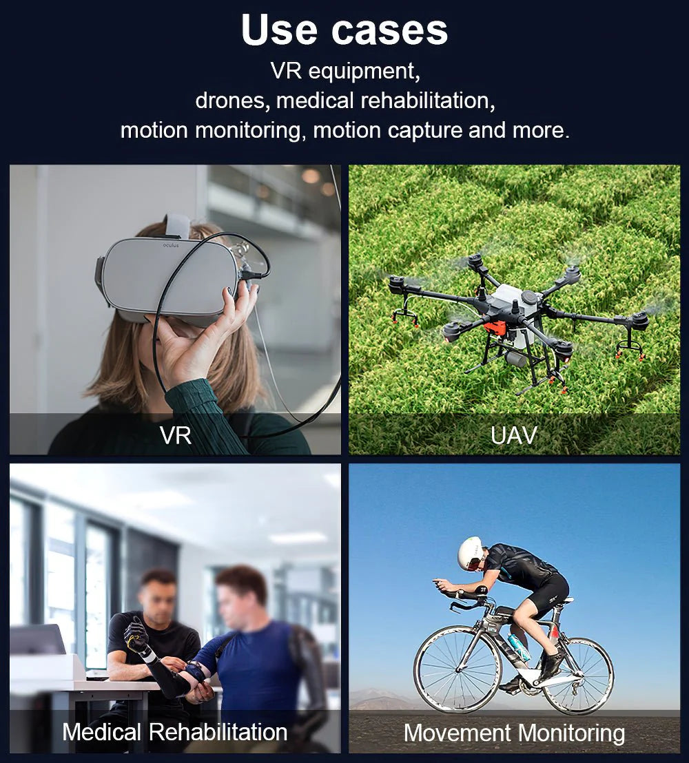 虛擬實境/擴增實境頭部/手部追蹤,機器人姿態感測,無人機/UAV 姿態記錄,運動 &及體育監測,醫療康復,手勢識別,以及互動裝置。