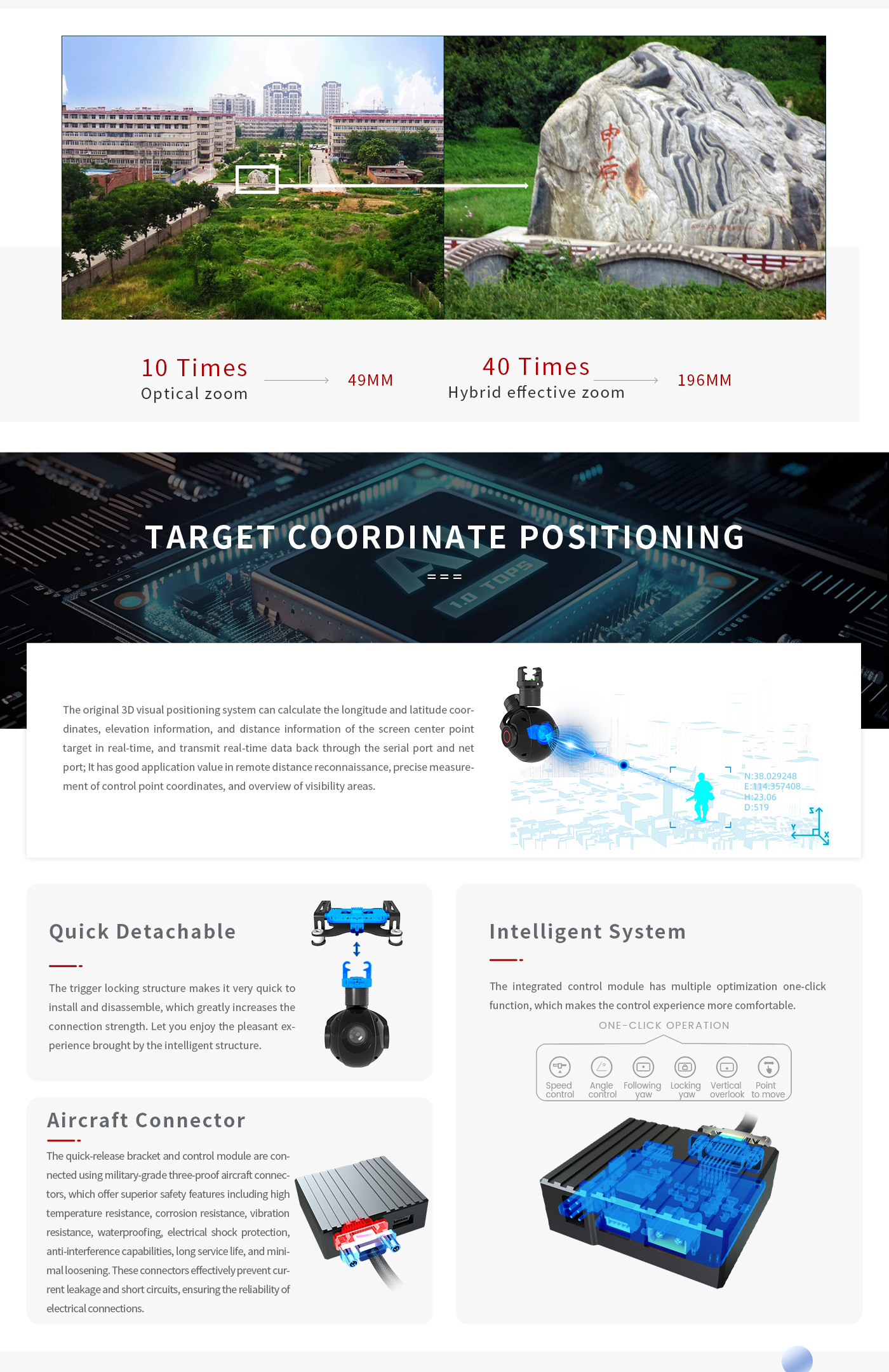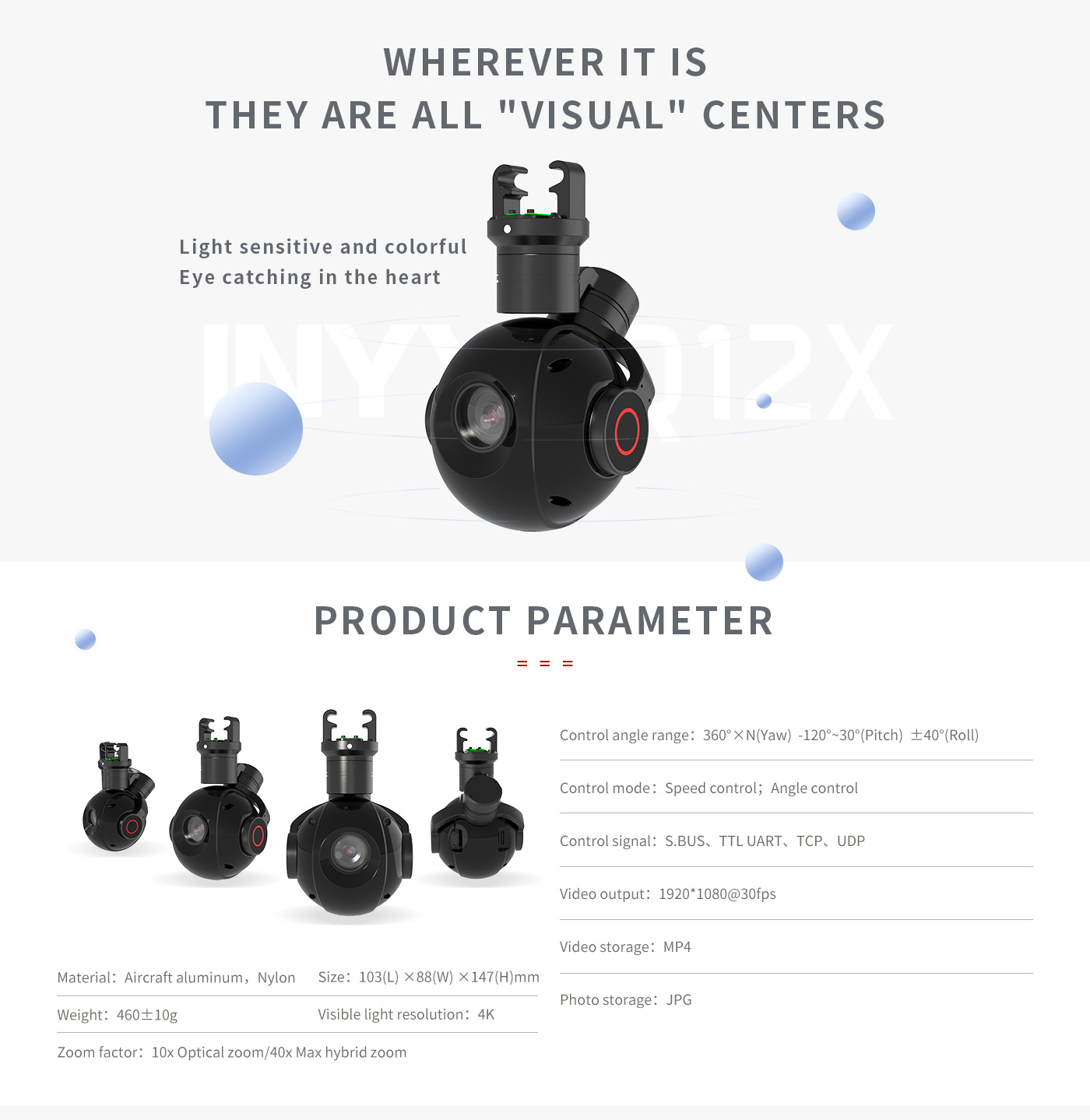 這 Zingto INYYO Q12X 雲台無人機相機 是一款最先進的單感測器光電吊艙,旨在提供無與倫比的成像性能。設計堅固 飛機鋁和尼龍結構,它為不同的操作環境提供了輕巧耐用的解決方案。特色 10倍光學變焦 和令人印象深刻的 40 倍混合變焦,它可確保為需要精確度的應用提供清晰、高清的視覺效果。其緊湊的尺寸(103毫米×88毫米×147毫米)和低重量(460±10克)使其成為無人機的理想選擇,在不影響性能的情況下提供增強的便攜性。