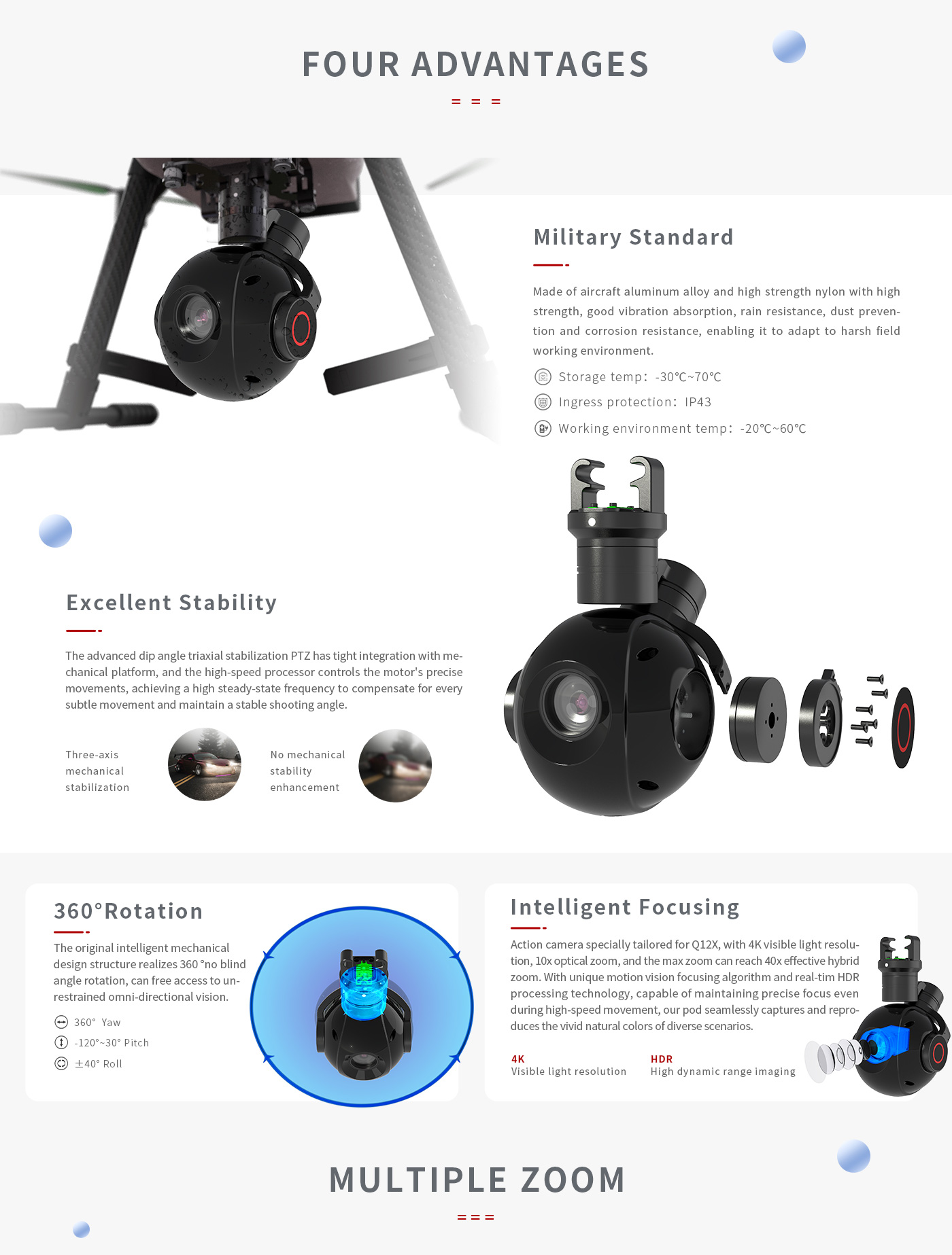 - 配備有 三軸萬向穩定係統,即使在具有挑戰性的條件下,Q12X 也能實現精確且穩定的影像。